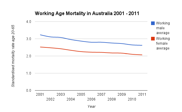 But there is considerable debate about whether that will keep going. I posted here in 2009 that there appeared to be a plateau for the mortality statistics in 2008. In the 2009 statistics, there some improvement, and in 2010, improvement seemed to slow down again. So what has happened in 2011? The statistics were released by the ABS in November, and here are a few snippets.